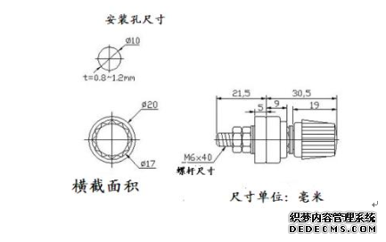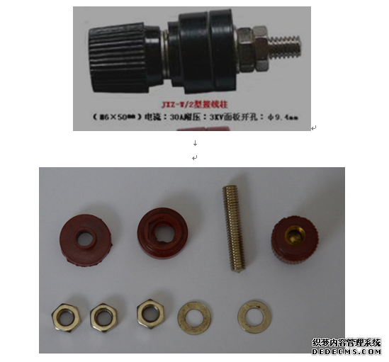 接线柱的绝缘部分是ABS,导电的螺栓是铜,固定的螺母和垫片是铁。接线柱M6×50㎜)电流:30A耐压:3KV面板开孔:φ9.4mm