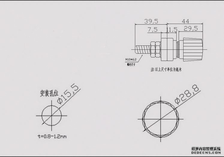 中间绝缘部分:上端高度12.5mm, 外部直径28.5mm,嵌入直径17.5*5mm椭圆螺母,中间是直径15.5mm的安装孔.下端高度14mm,外部直径28.5mm, 嵌在上端绝缘体直径为15.5mm(开孔直径)*高8mm。