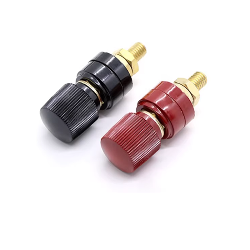 接线柱的绝缘部分是ABS,导电的螺栓是铜,固定的螺母和垫片是铁。接线柱M6×50㎜)电流:30A耐压:3KV面板开孔:φ9.4mm